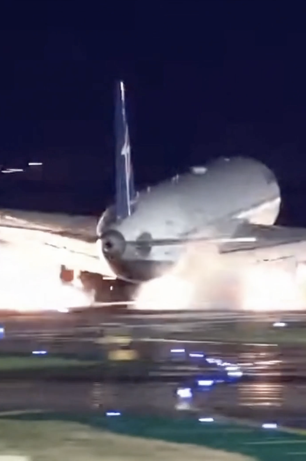 International Airport – Last night, a commercial passenger plane experienced a fire incident during landing. Sparks appeared from the left wing as the plane’s wheels touched the runway, quickly igniting flames under the wing.