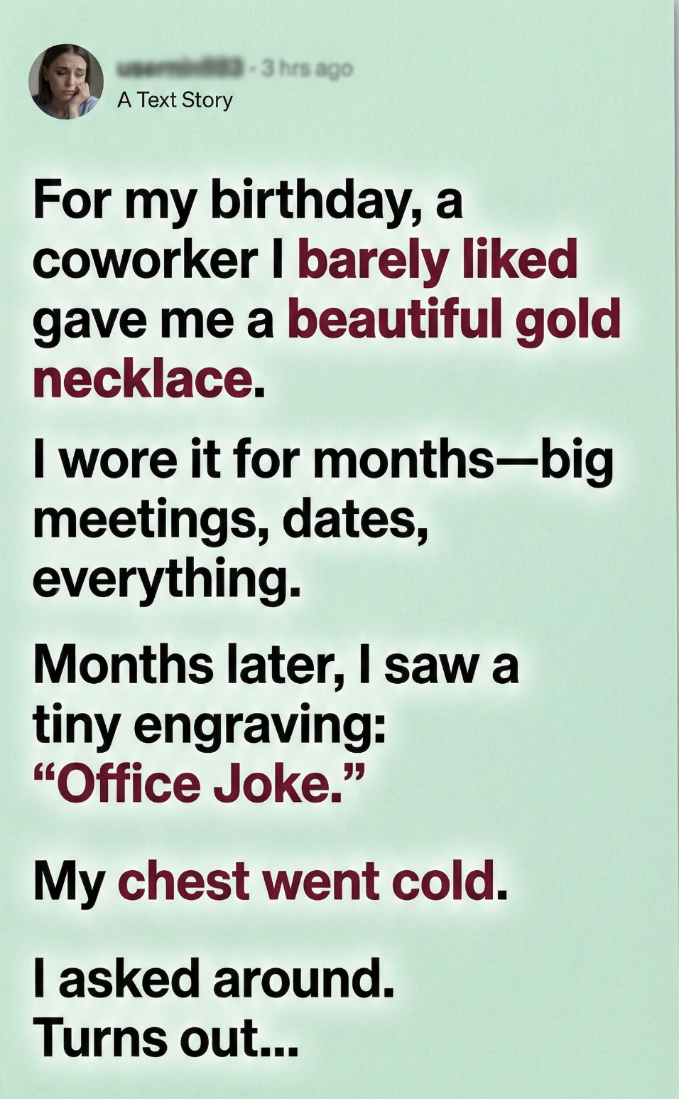 “He used to do this thing… where he’d buy cheap necklaces online and give them to women at the office. Then he’d dare people to see how long they’d wear it without noticing the engraving.”