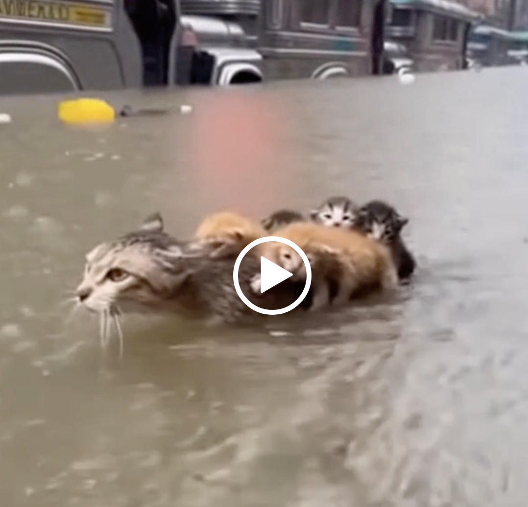 จากภาพเหตุการณ์ แม่แมวพยายามฝ่ากระแสน้ำที่สูงจนเกือบมิดลำตัวทุกครั้งที่หายใจ ลูกแมวตัวเล็กทั้งห้าตัวเกาะแน่นบนหลังของมันด้วยความหวาดกลัว ส่งเสียงร้องแผ่วเบา ในขณะที่แม่แมวไม่ยอมละความพยายาม มันพยายามว่ายน้ำต่อไปเพื่อหาที่ปลอดภัย แม้กระแสน้ำจะพัดแรงและมีเศษขยะลอยอยู่รอบตัว