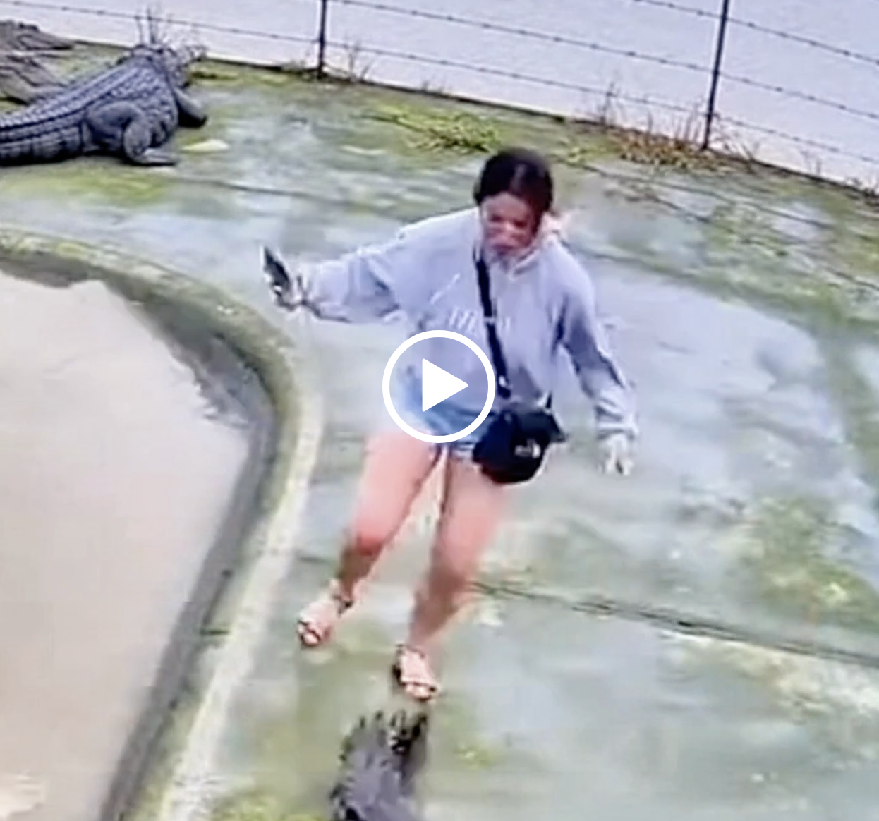 A brief moment of misstep at a rural crocodile breeding farm nearly turned into a life-threatening incident when a young woman slipped and fell partially into a pond filled with multiple crocodiles. The event, captured on what appeared to be a security camera, has gone viral online due to how close the situation came to becoming deadly.