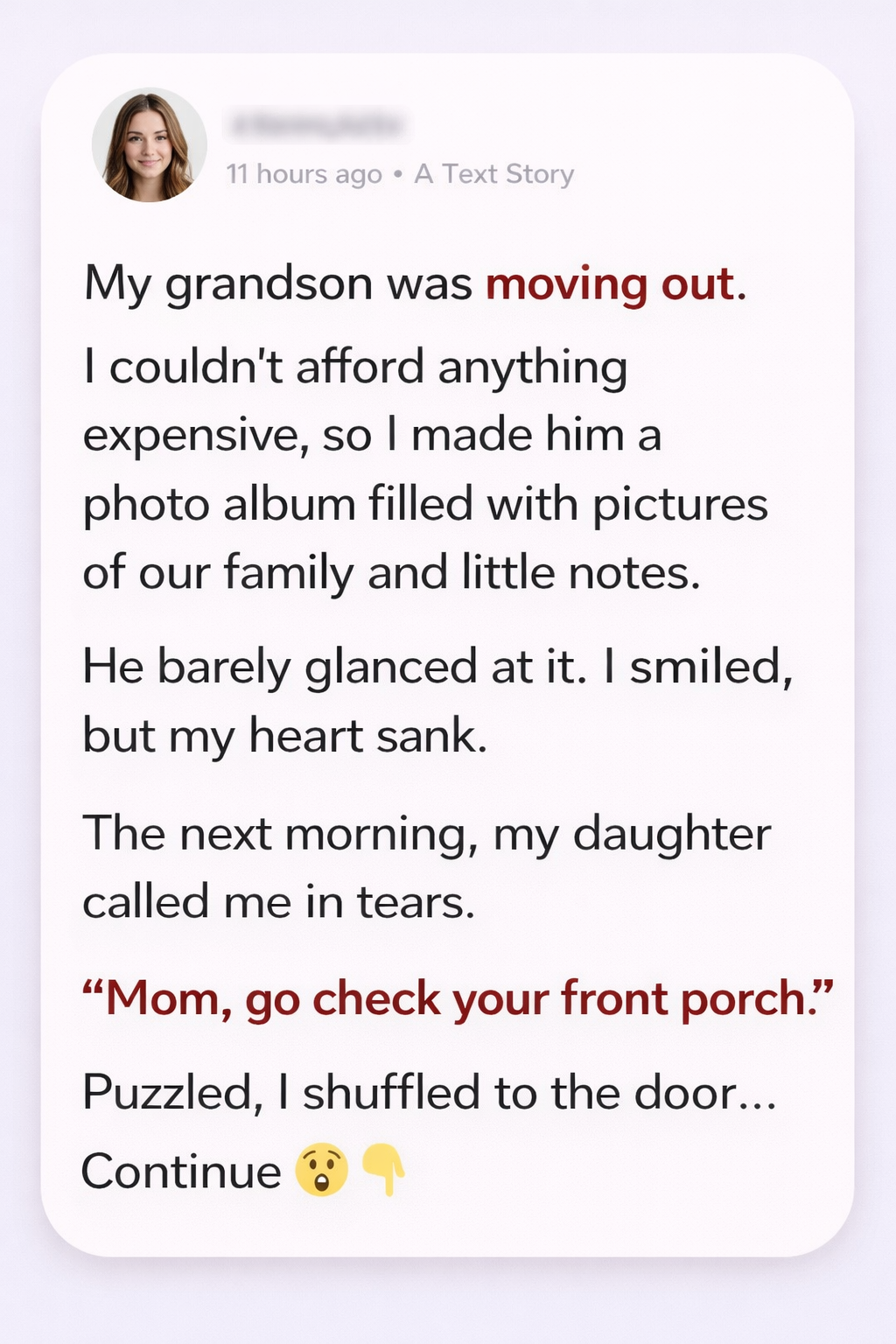 When I handed it to him on moving day, he barely opened it. Just a quick glance at the cover, a quiet “Thanks, Grandma,” and then he went right back to packing boxes. I smiled so he wouldn’t see how deeply his reaction stung, but later that night, sitting alone in my too-quiet house, I found myself wondering if the album had meant anything to him at all… or if it was just one more reminder that the world he was stepping into no longer had much room for me.