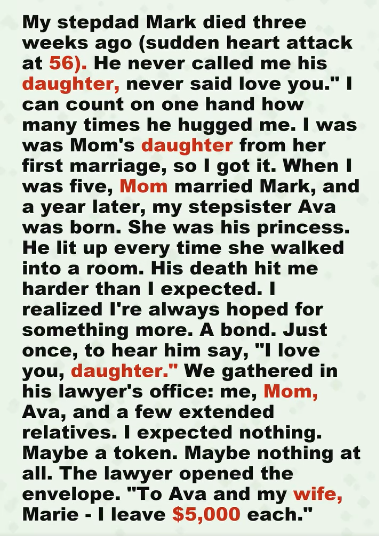 My stepdad Mark died three weeks ago. Sudden heart attack. Fifty-six. No warning, no goodbye—just gone. And the part that confused me the most was how hard it hit me. Because Mark and I weren’t close. Not in the way people expect. He never called me his daughter. Never said “I love you.” I can count on one hand how many times he hugged me, and even those moments felt… hesitant. Like he wasn’t sure he was allowed to. I was my mom’s daughter from her first marriage, so I understood, or at least I told myself I did. When I was five, Mom married Mark. I remember looking up at him in that suit, wondering if this was the day I got a dad. It wasn’t. A year later, my stepsister Ava was born, and everything changed. She was his whole world. His princess. He lit up every time she walked into a room, like she was the best thing that had ever happened to him. I used to stand in the hallway sometimes, watching them laugh together, waiting for him to notice me too. Waiting for even a fraction of that warmth. But it never really came. He wasn’t cruel. He didn’t yell or push me away. He just… kept a distance. Like there was an invisible line between us neither of us knew how to cross.