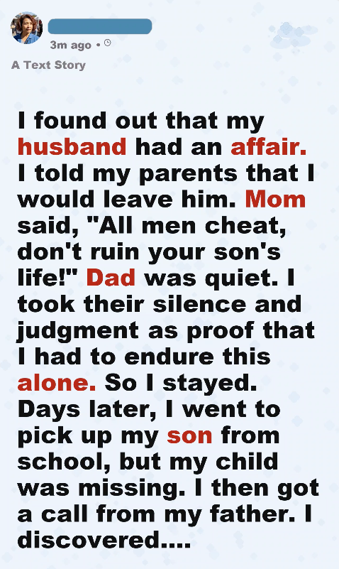 I found out my husband was having an affair on a Tuesday. Not because he told me, not because he felt guilty, but because of a message that wasn’t meant for me. A name saved as “work,” a text that said, “Last night meant everything. When will you leave her?” My hands went cold. My chest felt tight. In that moment, everything I believed about my marriage collapsed. That night, I sat across from him at dinner and watched him smile like nothing was wrong. He talked, laughed, asked about my day, and I realized something that hurt even more than the betrayal—he wasn’t even trying to hide it anymore. The next morning, I went to my parents. I thought they would support me. I thought they would tell me to leave, to protect myself, to protect my son. Instead, my mom looked at me and said, “All men cheat. Don’t ruin your son’s life over something like this.” Her words hit me like a slap. I turned to my dad, hoping for something—anything—but he just sat there in silence, not meeting my eyes. That silence broke me. Because in that moment, I felt completely alone. So I stayed. Not because I forgave him, not because I wanted to, but because I felt like I had nowhere else to go. Every day after that felt heavier. Every word from him sounded fake, every touch felt wrong, every smile felt like a lie. But I stayed. For my son.