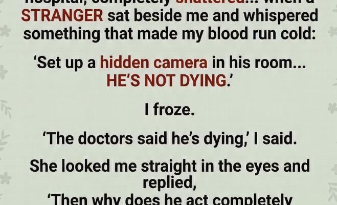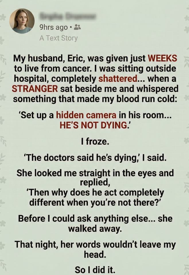 My husband, Eric, was given just weeks to live from cancer. The doctor’s words didn’t just break me—they erased everything I thought my future would be. We had been married for 12 years. He was my safe place, my partner in everything, the person I trusted more than anyone in this world. So when I walked out of that hospital room, I wasn’t just devastated—I was hollow. I sat outside on a cold metal bench, staring at nothing, trying to understand how life could just… end like that. That’s when a woman I had never seen before sat down beside me. She didn’t ask if I was okay. She didn’t introduce herself. She simply said, in a calm, steady voice, “Set up a hidden camera in his room. He’s not dying.” I turned to her, confused and slightly offended. “What are you talking about? The doctors said he’s dying.”