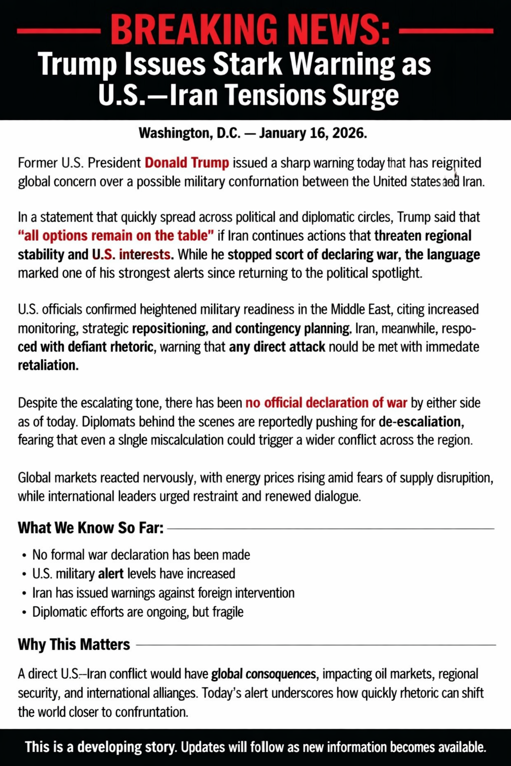 A direct U.S.–Iran conflict would have global consequences, impacting oil markets, regional security, and international alliances. Today’s alert underscores how quickly rhetoric can shift the world closer to confrontation.