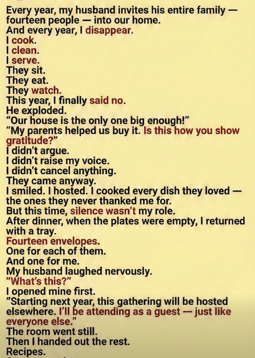 I planned the menu weeks in advance. I cleaned the house top to bottom. I cooked for days. I served plates while conversations flowed around me like I wasn’t there. When the last guest left, I was still scrubbing pans while everyone else slept.