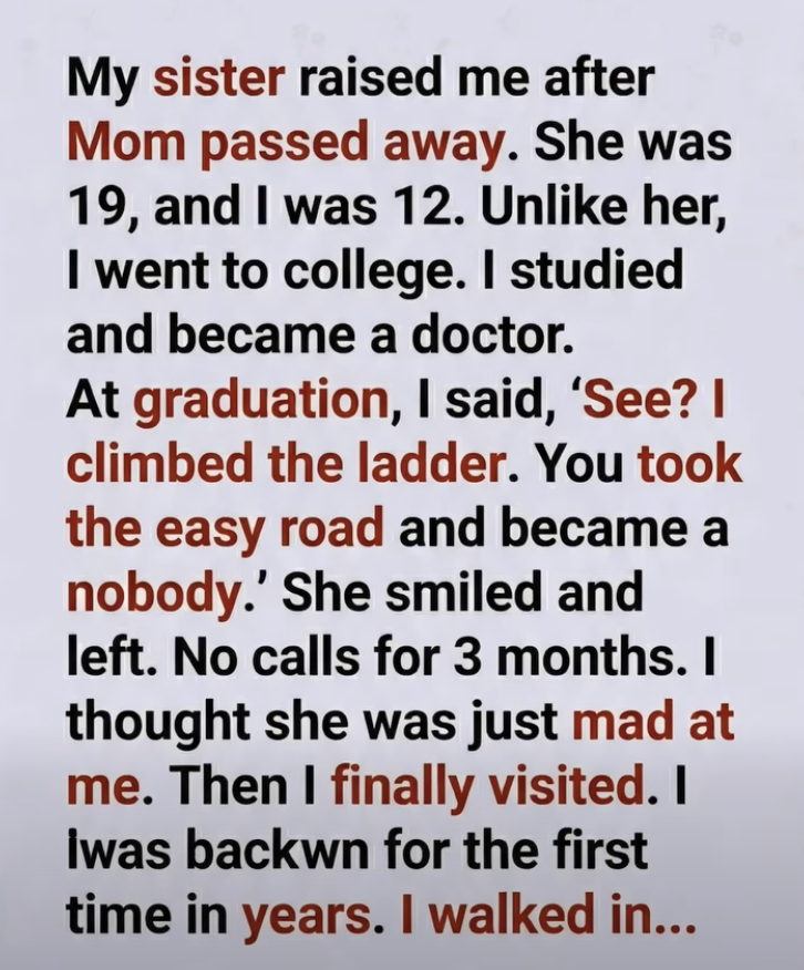 My sister raised me after Mom passed away. She was 19, and I was 12. While other girls her age were going to college, going out, building their lives… she stayed behind for me. She worked two jobs, sometimes three. She cooked, cleaned, helped me with homework, and made sure I never felt like I had lost everything. But I didn’t see it that way. To me, she was just… there. When I got older, I promised myself I wouldn’t live like that. I studied hard, pushed myself, got into college, then medical school. I became everything she never was. At least, that’s what I believed.