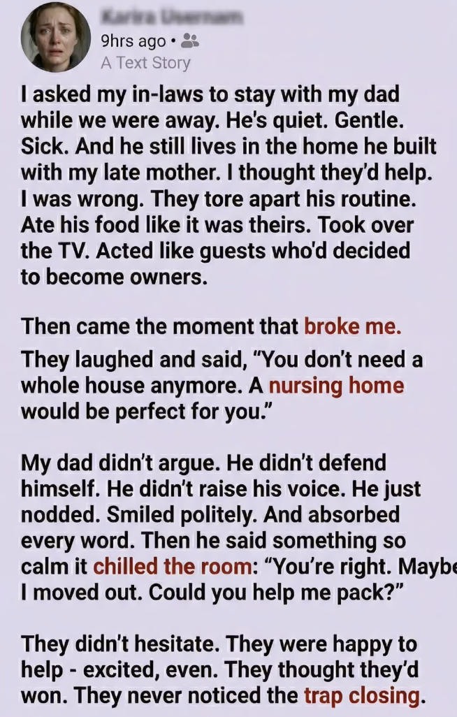I asked my in-laws to stay with my dad while we were away. He was quiet, gentle, and not in the best health. He still lived in the home he built with my late mother, a place filled with memories, routines, and the kind of silence that only comes from loss. I thought they would help him. Keep him company. Make things easier.