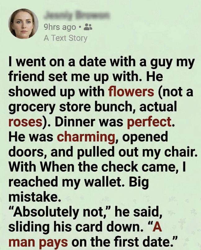 “Absolutely not,” he said smoothly, sliding his card down before I could even unzip my purse. “A man pays on the first date.”