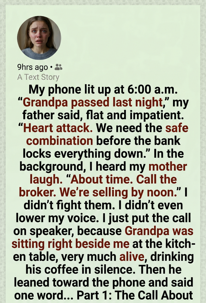 “Grandpa passed last night,” he said immediately, his voice flat, impatient, almost annoyed. “Heart attack. We need the safe combination before the bank locks everything down.”
