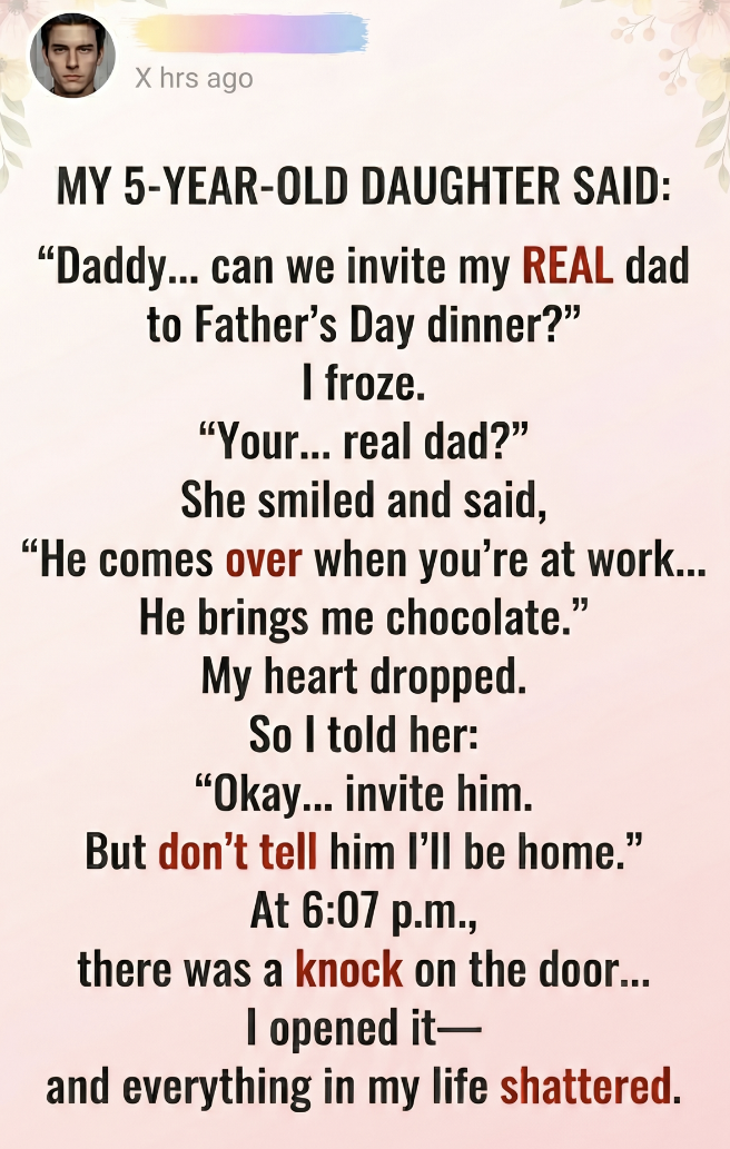 I laughed at first, not because it was funny, but because I didn’t understand. “Your… real dad?” I asked, forcing a smile, hoping she’d say it was a joke. But she didn’t laugh. She just looked at me calmly and said, “He comes over when you’re at work. He brings me chocolate.” Something inside me went cold. I didn’t question her further. I just nodded and said, “Okay… invite him. But don’t tell him I’ll be home.” She smiled, completely innocent, and went back to playing.