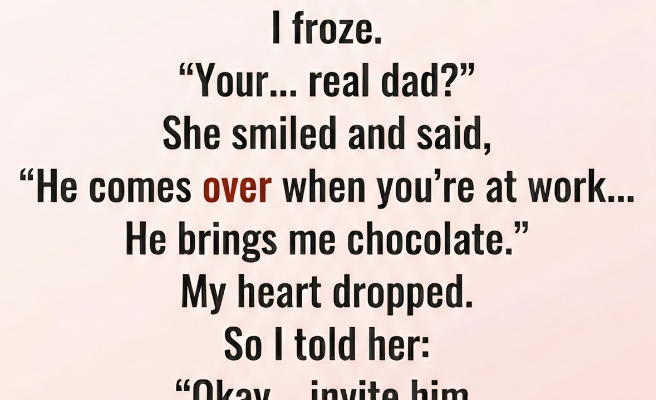 I laughed at first, not because it was funny, but because I didn’t understand. “Your… real dad?” I asked, forcing a smile, hoping she’d say it was a joke. But she didn’t laugh. She just looked at me calmly and said, “He comes over when you’re at work. He brings me chocolate.” Something inside me went cold. I didn’t question her further. I just nodded and said, “Okay… invite him. But don’t tell him I’ll be home.” She smiled, completely innocent, and went back to playing.