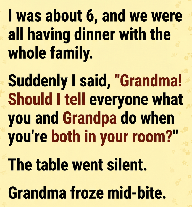 In the middle of the chatter, I suddenly spoke up with excitement. “Grandma! Should I tell everyone what you and Grandpa do when you’re in your room?” The second the words came out of my mouth, the entire table fell completely silent.