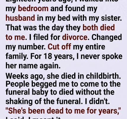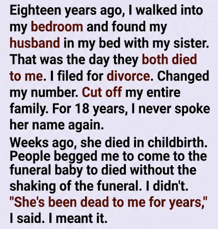 Eighteen years ago, I walked into my bedroom and found my husband in my bed with my sister. That was the day they both died to me. I filed for divorce. Changed my number. Cut off my entire family. For 18 years, I never spoke her name again. Weeks ago, she died in childbirth. People begged me to come to the funeral. I didn’t. “She’s been dead to me for years,” I said. I meant it. But the next morning, there was a knock on my door. A lawyer stood there. And when he handed me the envelope she left behind… my blood ran cold. Because my sister hadn’t just left a letter. She had left something else. Something that erased those 18 years.