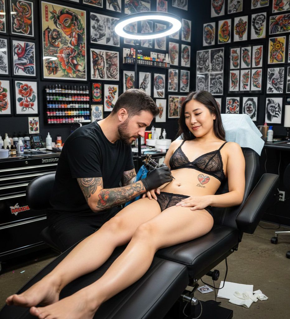 A photorealistic scene inside a professional tattoo studio. A dark-haired Asian woman in black lingerie sits in a tattoo chair, displaying a graceful facial expression. The tattoo artist, wearing black gloves and using a tattoo machine, inks the woman’s abdomen, creating a realistic image of a small heart and the word “love” on her chest. The man, wearing a black t-shirt, holds a tattoo machine and carefully applies the tattoo to the woman. The studio walls are lined with framed tattoo designs and flash artwork. The atmosphere is modern, brightly lit, and filled with tattoo equipment, ink, and tools. High detail, sharp focus, bright colors, a humorous and expressive atmosphere, a candid moment.