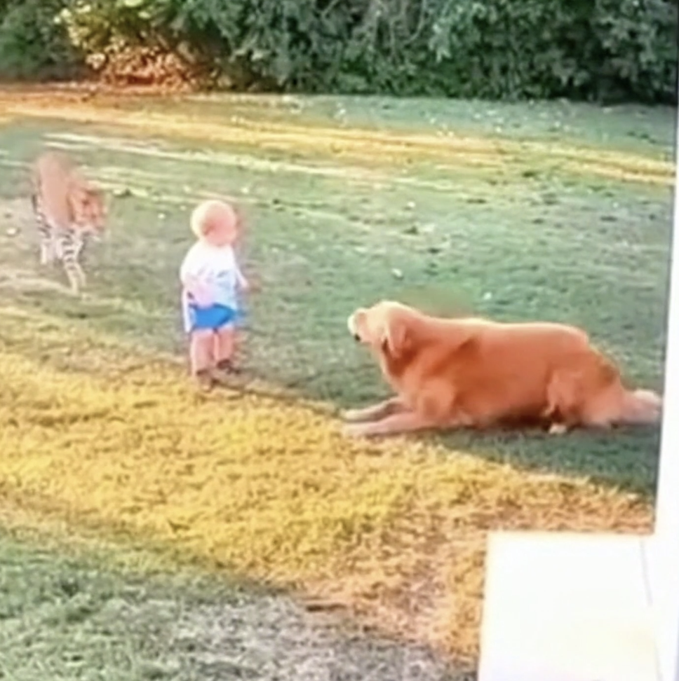 The footage, reportedly recorded at a rural home, shows the toddler standing near the grass while holding a small toy bucket. The family’s Golden Retriever was resting nearby when it suddenly sensed danger. Within seconds, a leopard emerged from the bushes and began moving toward the child in a predatory stance.
