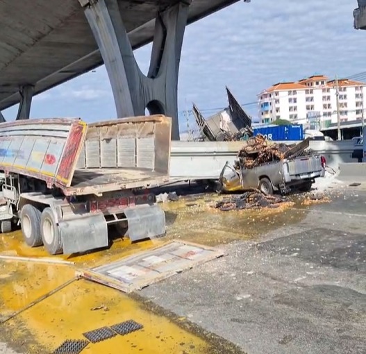 BREAKING: Pedestrian overpass collapses onto a truck and a pickup on Thep Ratthanakorn Road in Samut Prakan on Thursday. People are injured and trapped inside the vehicles. Officials are rushing to the scene to investigate